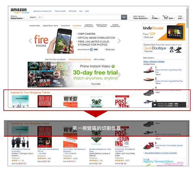 以Amazon網(wǎng)站首頁為例,無論以1024 x 768或1280 x 800等解析度瀏覽網(wǎng)站,第一視覺區(qū)中滿足了上述四個元素,放置了最重要的資訊、圖片,并讓使用者感覺網(wǎng)頁下方還有內(nèi)容,增加往下瀏覽的意愿。