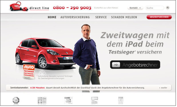 在多螢時(shí)代,網(wǎng)絡(luò)營(yíng)銷(xiāo)必須通盤(pán)考量各種平臺(tái)。因此,不論是pc版或移動(dòng)版網(wǎng)頁(yè)上的按鈕,都必須一樣醒目、好操作。英國(guó)保險(xiǎn)公司 Direct Line 的 iPad 網(wǎng)頁(yè),就讓按鈕以平板裝置消費(fèi)者習(xí)慣的滑動(dòng)方式來(lái)運(yùn)作(如下圖)。