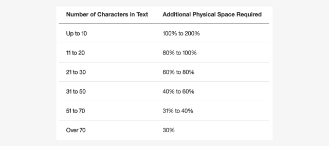 IBM’s globalization 網(wǎng)站中有個(gè)非常有用的表格,上方告知若要將英文翻譯成其他語(yǔ)言,需要的空間大概是多少。